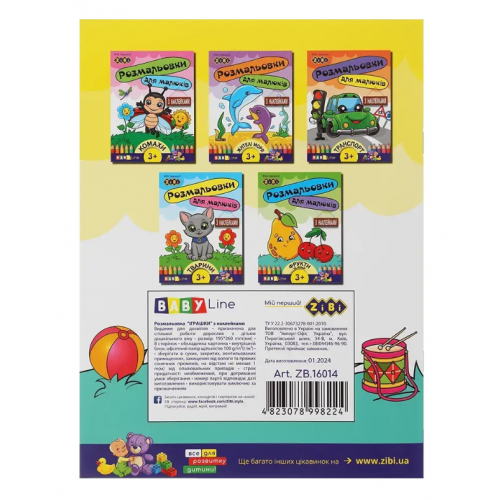 Розмальовка від ZiBi для малюків – це чудовий інструмент для проведення дозвілля з дитиною. Розмальовування сприяє розвитку творчих здібностей, дрібної моторики, посидючості, наполегливості та вивченню кольорів. Тематичні малюнки кожної розмальовки допоможуть малюку пізнавати світ та отримувати позитивні емоції!