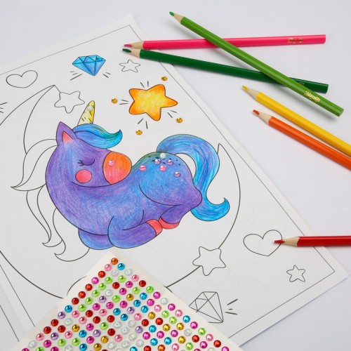 Завдяки стразам розфарбовування стає ще більш захопливим: дитина вчиться поєднувати кольори, додавати об’єм і блиск, розвиває почуття стилю та радіє результату. Кожна сторінка перетворюється на маленьке диво, де єдинороги оживають яскравими барвами та сяючим декором.