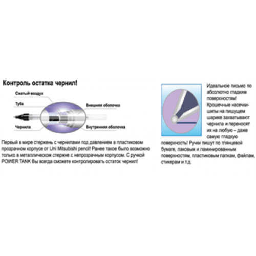 UNI POWER TANK Автоматична кулькова супер ручка, яка не підведе Вас ніколи!!! Завдяки особливій формулі пігментних чорнил на масляній основі UNI Super-Ink (зберігають записи понад 100 років), спеціальному пишучому вузлу і кульці з насічками, UNI Power Tank пише навіть під водою і по ідеально гладких поверхнях. Проливний дощ, розлита вода, мороз нижче -20°С, глянцевий папір ... Пише навіть пишучим вузлом догори! Для POWER TANK не існує ніяких перешкод!