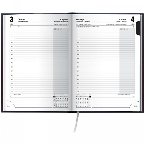 Особливості: Три мови: українська, англійська, німецька. Загальна кількість сторінок — 336. Одна сторінка — один день.