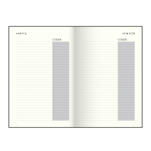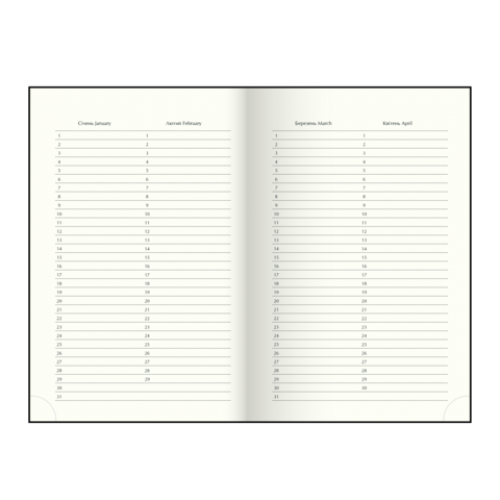 Жорстка обкладинка зі штучної шкіри щоденника LEROY виконана з вишуканого фактурного матеріалу, має елегантне тиснення фольгою на лицьовій стороні та магнітну металеву застібку-хлястик, яка зафіксує щоденник в закритому положенні. Гармонійно доповнює дизайн тонований в колір обкладинки зріз внутрішнього блоку.