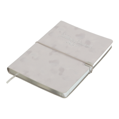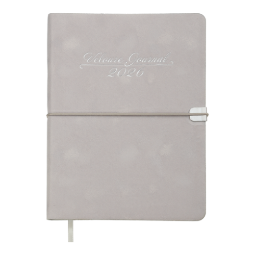 Гнучка обкладинка щоденника VELOUR виконана з штучної шкіри з виразним оксамитовим покриттям. Дві функціональні шильди на лицьовій та зворотній стороні обкладинки з поглибленнями для поперечної гумки забезпечують зручну та надійну фіксацію щоденника в закритому стані. Дизайн гармонійно доповнює та збагачує тонований срібним кольором зріз внутрішнього блоку та тиснення срібною фольгою року і напису на лицьовій стороні обкладинки.