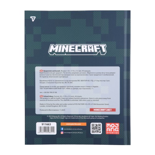 Щоденник "Minecraft" торгової марки Yes призначений для заповнення домашніх завдань учнем, виставлення оцінок вчителями та батьківського контролю за успішністю