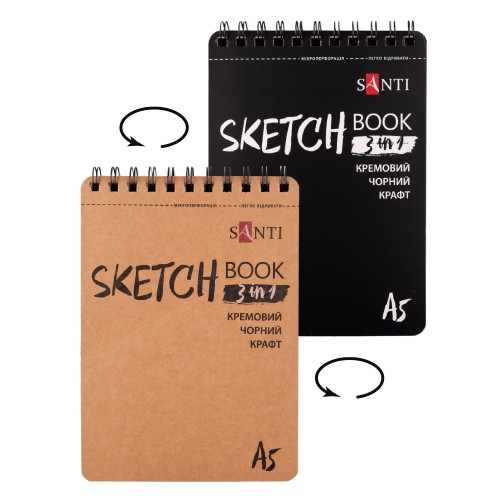 Скетчбук SANTI DUAL 3 в 1 для графики с крафт черной и кремовой бумагой A5 33 листа на пружине
