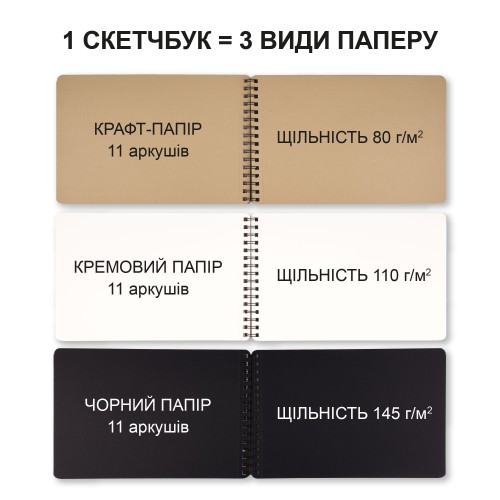 - щільність паперу: чорна - 145г/м², крафт - 80г/м², кремова для скетчингу - 110г/м²