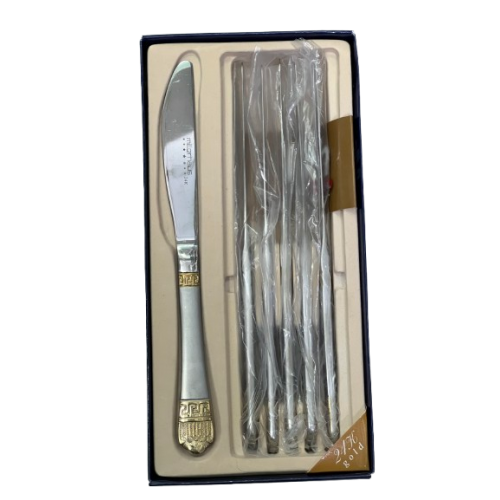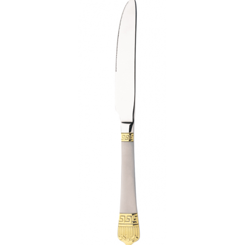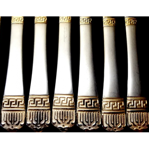 Столові ножі з декоративним грецьким орнаментом, 6 штук, блискучі сріблясті ножі із золотистим орнаментом, 23 см