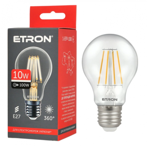 ETRON Filament A60 10W E27 4200K прозора – сучасне рішення для внутрішнього освітлення житлових приміщень та використання в освітлювальних приладах, розміщених зовні (за умови відповідного ступеня захисту). Вона поєднує стильний дизайн і передові світлодіодні технології, забезпечуючи яскраве нейтральне біле світло з колірною температурою 4200K.