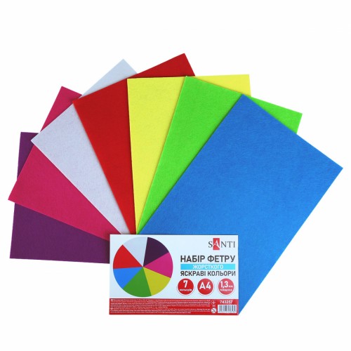 Фетр листовий (поліестер) 21х30см SANTI 743257 180г/м, яскраві кольори (жорсткий) (7арк.) (ціна за уп.) /743257/