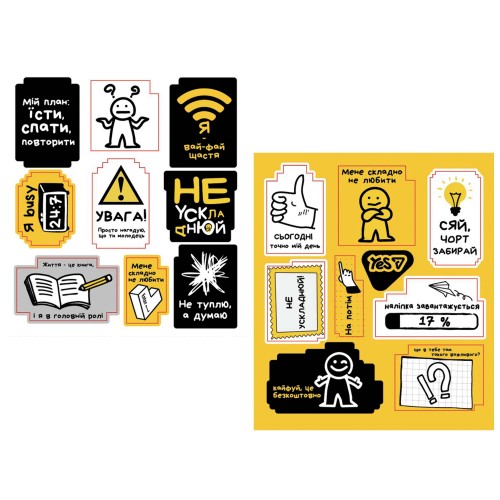 У наборі стікерів "Не ускладнюй!" ТМ Yes — 2 аркуші розміром 130×150 мм із позитивними ілюстраціями та мотивуючими елементами (як на фото за посиланням). Контур кожного стікера акуратно прорізаний у верхньому шарі самоклейного паперу та легко знімається з підкладки, тож користуватися ними зручно навіть дітям. Стікери чудово приклеюються на будь-яку знежирену поверхню: папір, дерево, пластик, метал тощо.